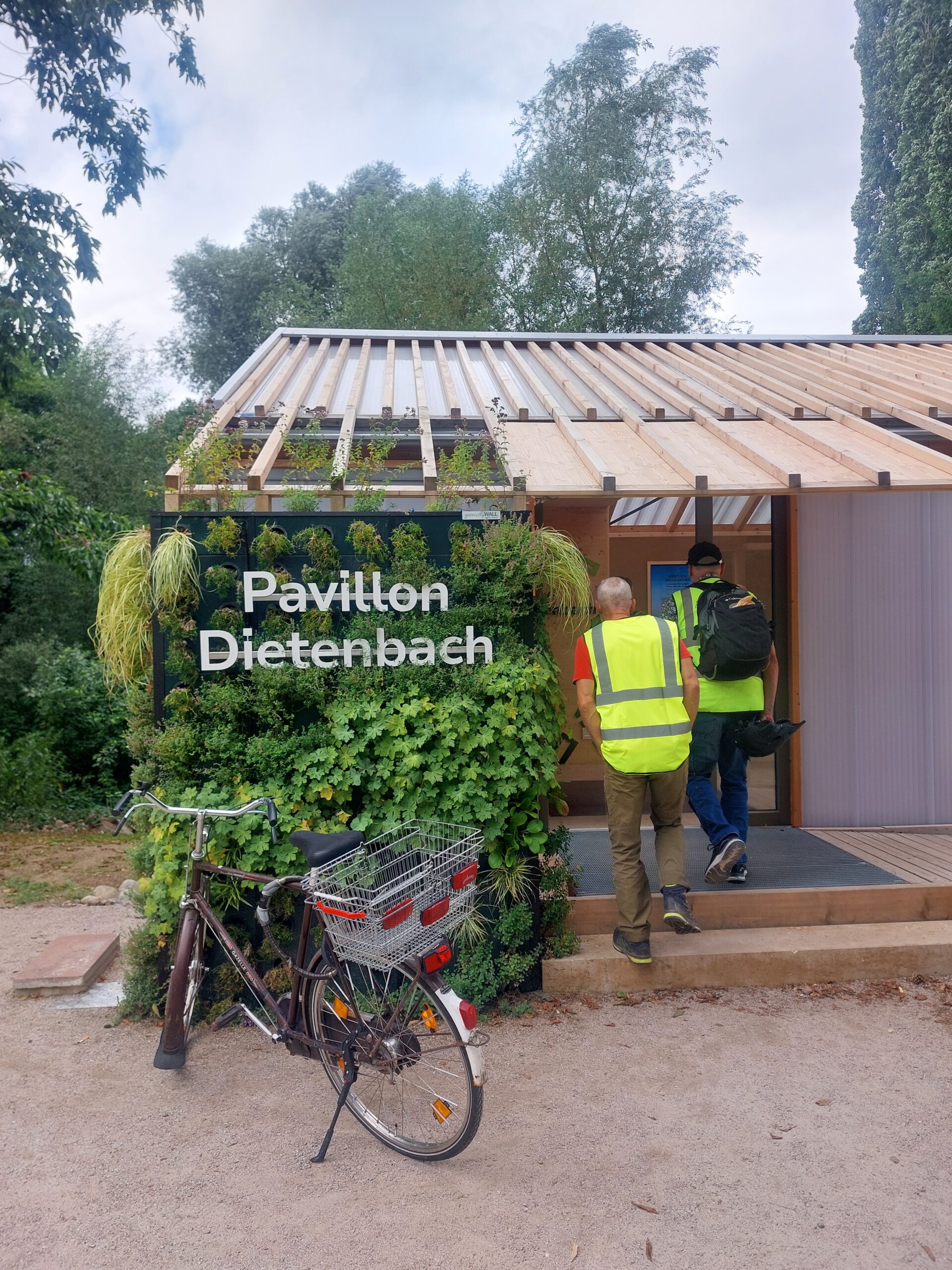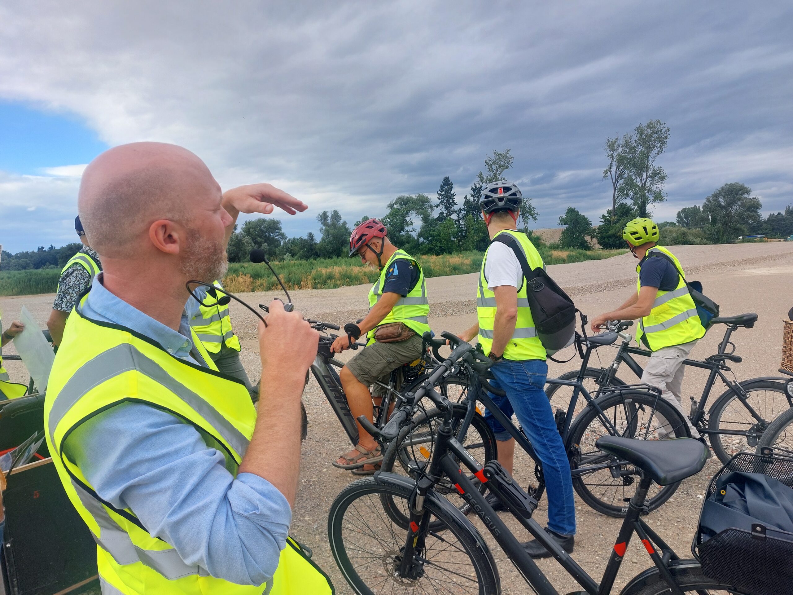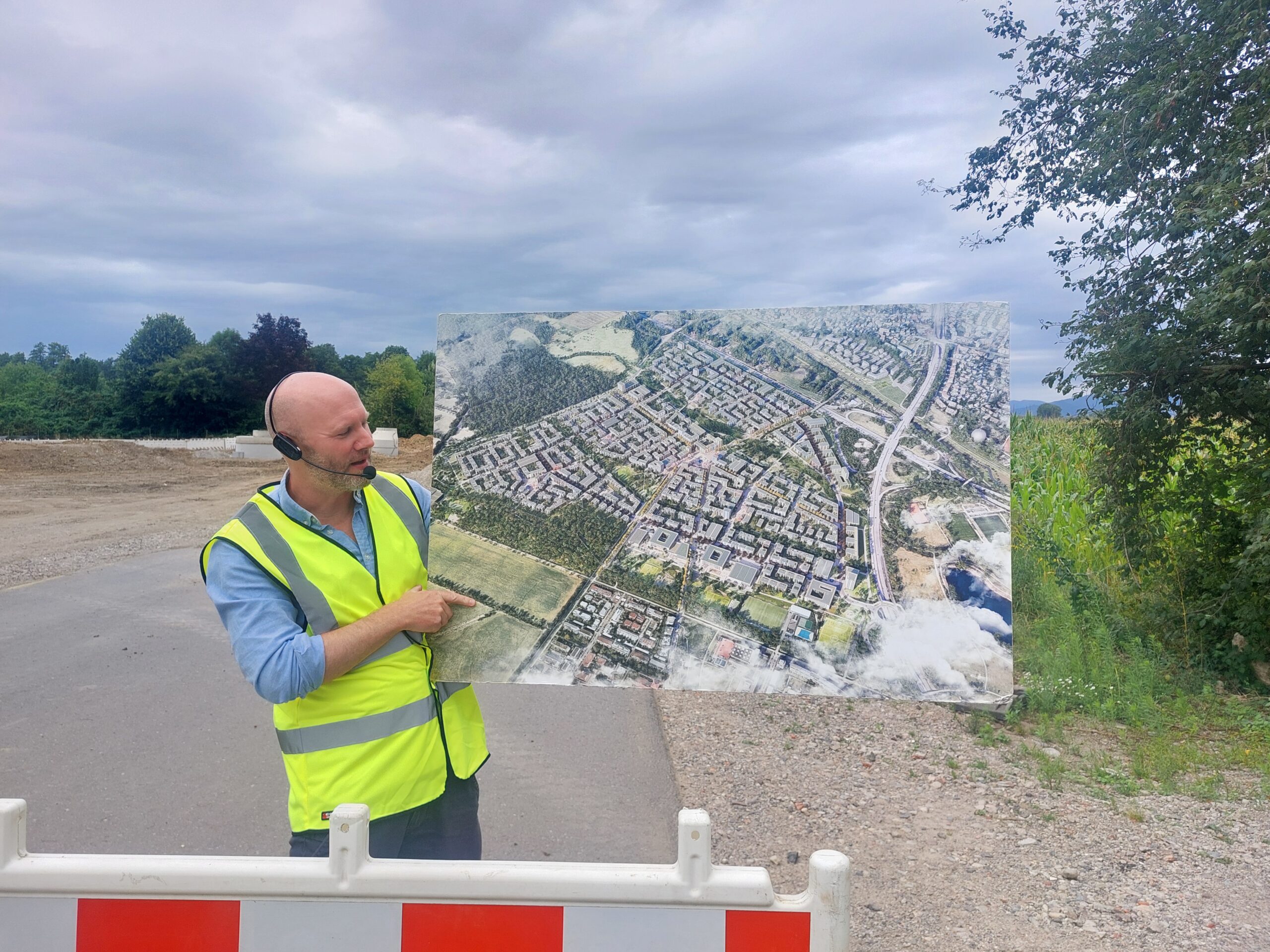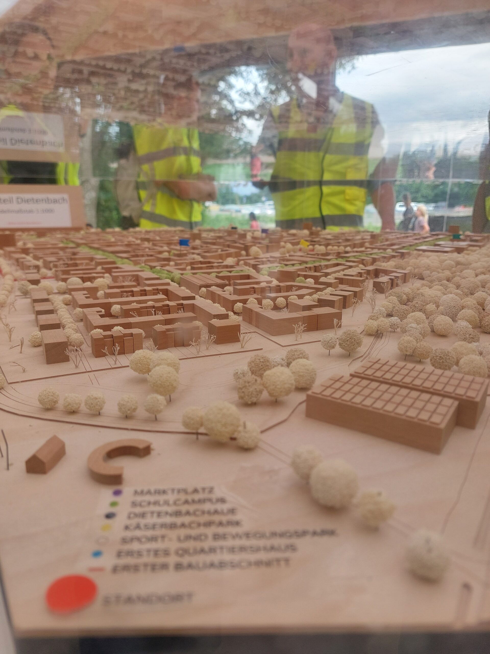 Vergangenen Mittwochnachmittag stehen daher 13 Menschen aus den unterschiedlichsten Ämtern und Dienststellen am Mundenhof parat. Mit grell-leuchtenden Warnwesten nicht zu übersehen – safety first! Doch bevor sich die Gruppe auf den Fahrrädern in Bewegung setzt, um den künftig neuen Stadtteil zu erkunden, erklärt Ingo Breuker, stellvertretender Leiter der Projektgruppe, vor einem Modellbau im neuen Pavillon Dietenbach, wie der Stadtteil einmal aussehen soll.