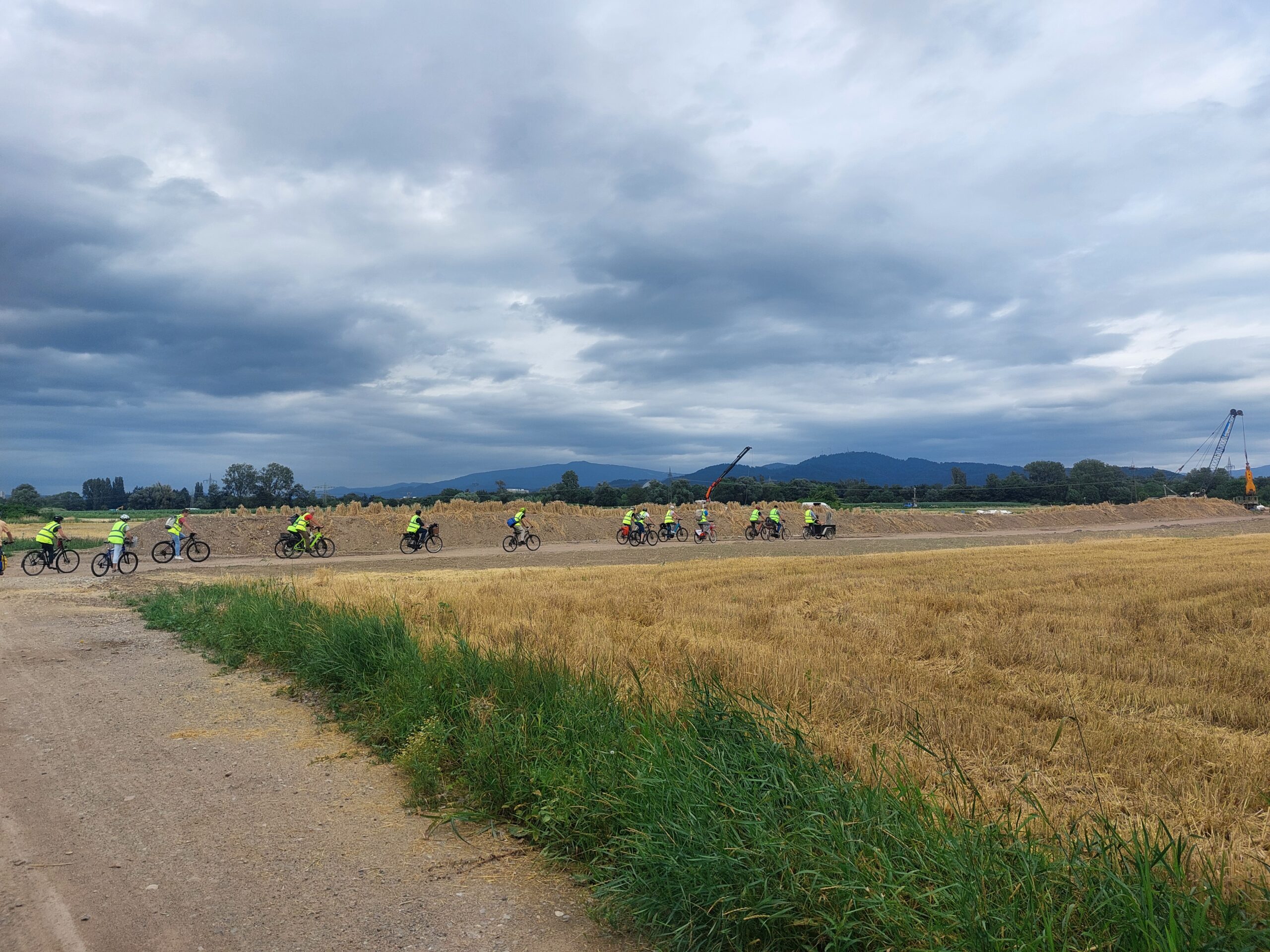 Holzbauweise, viele Grünflächen, schattige Parkanlagen und quirlige Quartierstreffen sollen entstehen. Inklusiv, barrierefrei, sozial, grün – Schlagworte, die sitzen und Ideen, die beeindrucken. Also ab aufs Rad und rein ins Geschehen. Entlang am Käslebach, vorbei am Sport vor Ort Rieselfeld e.V. und über weiter über Schotterwege. Immer wieder bleibt die Gruppe stehen, eine große Tafel wird in die Luft gehalten, auf der zu sehen ist, wie es hier einmal aussehen soll. 22 KiTas und eine Gemeinschaftsschule für über 1.600 Kinder und Jugendliche werden unter anderem umgesetzt. Die ersten Schüler*innen sollen bereits 2029 im ersten Gebäudeabschnitt unterrichtet werden.